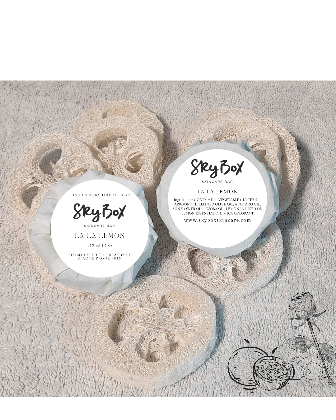 โจ For gentle exfoliation, our La La Lemon skincare creation features an embedded, organically grown, hand-picked, and dehydrated loofah sponge. This natural exfoliator buffs away dead skin cells, unclogs pores, and promotes a smoother and brighter complexion.