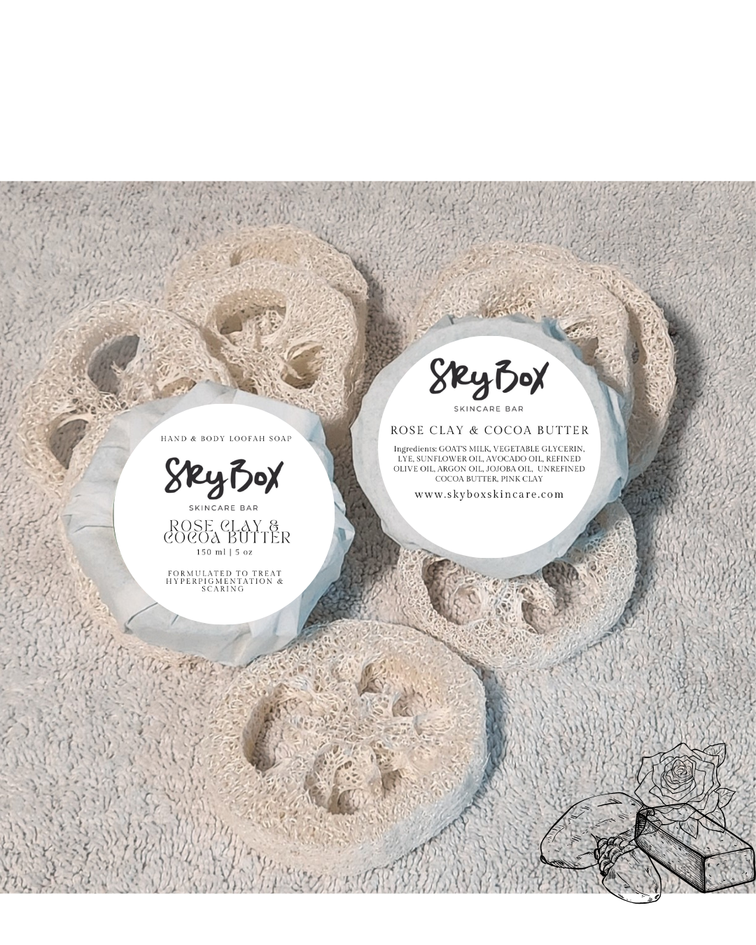 🌾🌼 To elevate your skincare experience, our Rose Clay & Cocoa Butter features an embedded organically grown, hand-picked, and dehydrated loofah sponge. This gentle exfoliator adds a touch of luxury to your routine, promoting skin renewal and leaving you with a luminous and refreshed feeling.