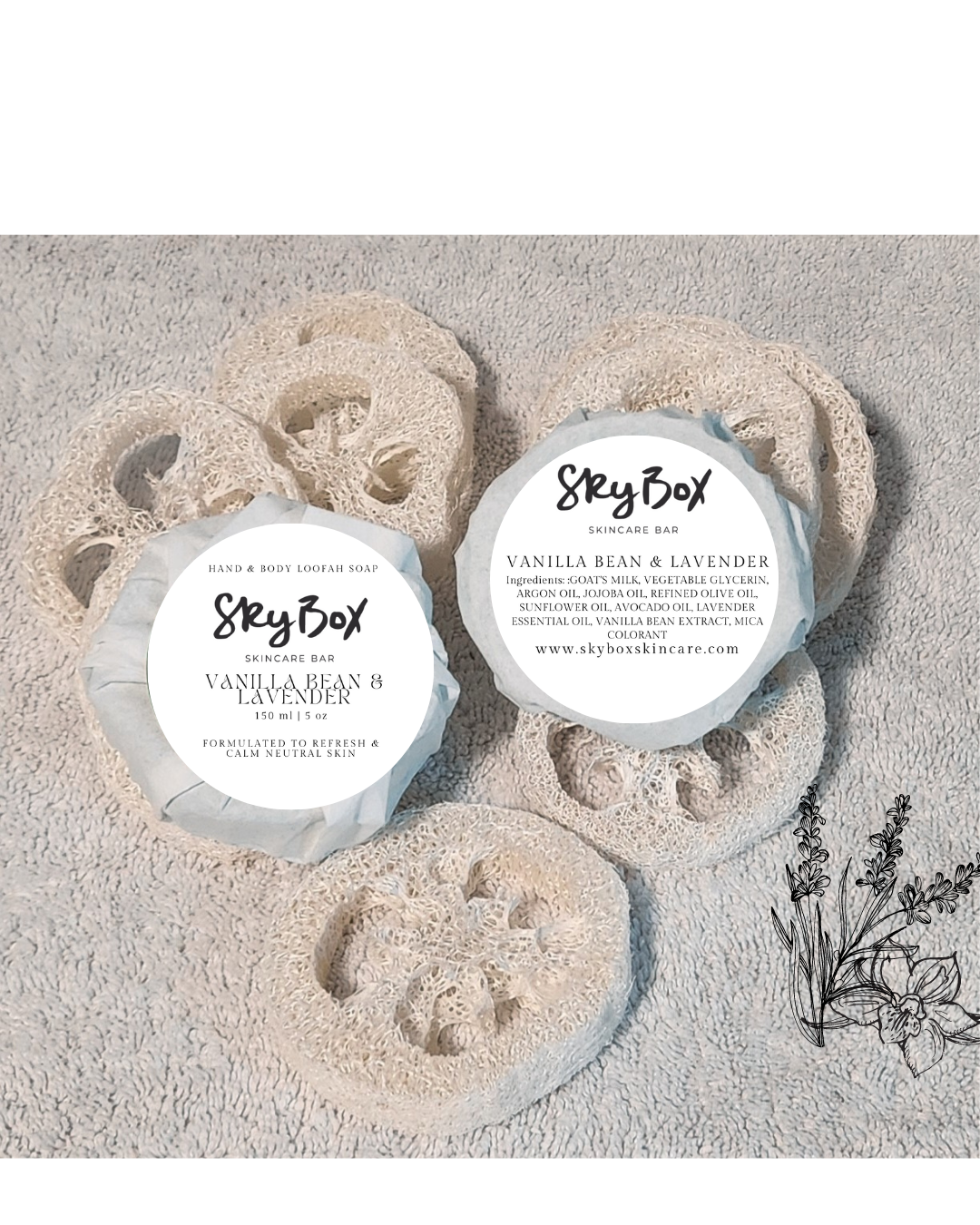 ✨ For a touch of exfoliation, our Vanilla Bean & Lavender skincare creation features an embedded, organically grown, hand-picked, and dehydrated loofah sponge. This natural exfoliator gently buffs away dead skin cells, revealing a smoother and more radiant complexion.